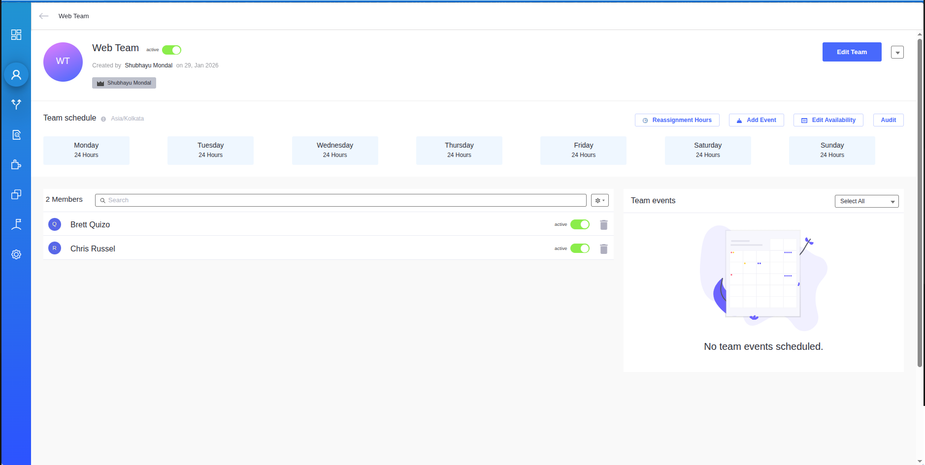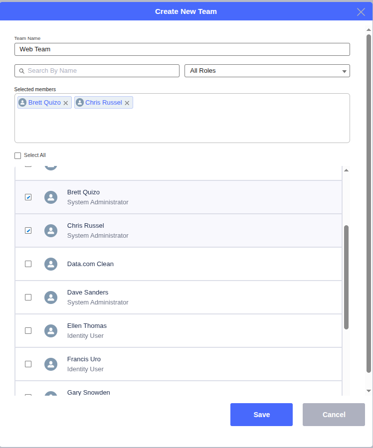 - Click on the Get Started. This opens up the Create New Team box. Type the team name and select the members for the team by checking the checkbox beside the name of the user. Click save.